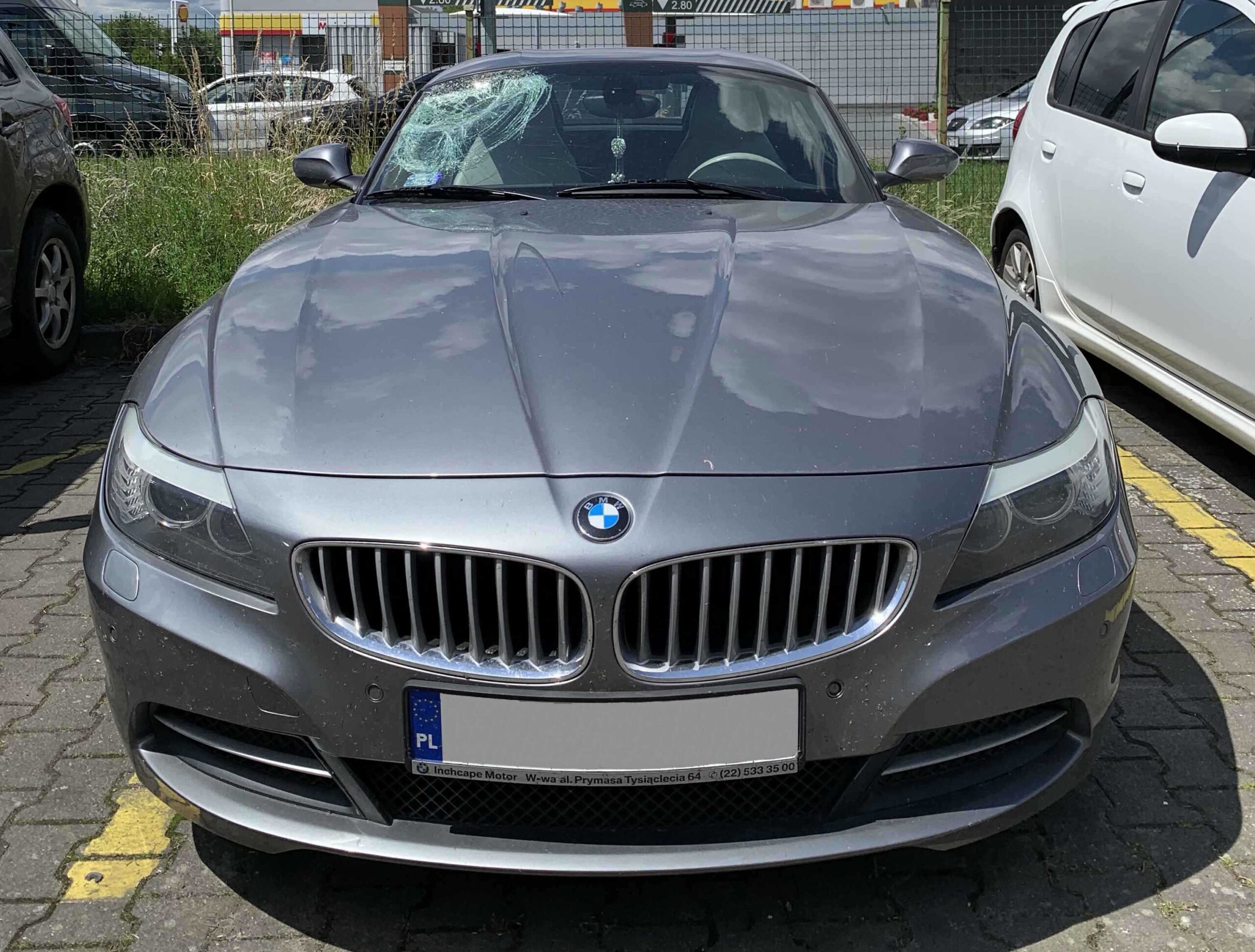 BMW Z4 – w kultowej stylistyce roadstera, które miało bliskie i nieprzyjemne spotkanie z leśną zwierzyną. Efekt? Rozbita szyba czołowa. Całe szczęście jelonek ślizgnął się i obyło się bez większych strat.